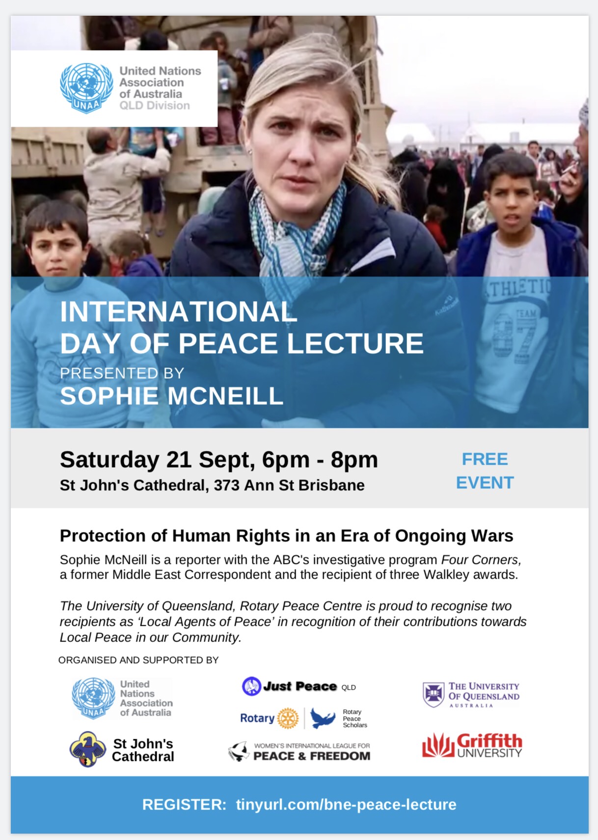 This is a free public event supported by UNAA Queensland, St John’s Cathedral, Just Peace, Rotary, Griffith Uni, UQ, WILPF, and Quakers.